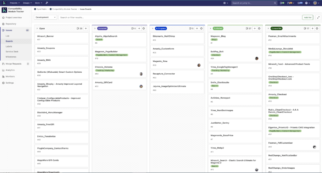 To enhance visibility and coordination, a Compatibility Module Tracker has been established. The left column displays modules that are currently incompatible with Hyvä, representing user requests. Hyvä license holders can express support for specific module requests by giving a Thumbs-Up to the corresponding ticket. Modules with a high number of votes may be prioritized for implementation by the Hyvä theme.